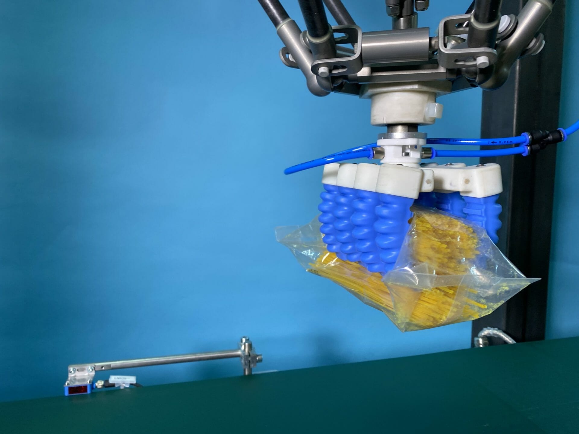 Manipulation de produits de boulangerie ensachés, comme du pain emballé et coupé, plusieurs petits pains dans un seul sac, des caisses en plastique avec des bonbons, des petits pains. Dans ce test, une pince plus grande était favorable. Ce n’est pas le poids des produits, mais la taille qui a été le principal facteur. Le pain ne pèse que 250 à 400 grammes. Même les plus gros morceaux de pâte utilisés pour la production de pizzas ou comme matière première pour les petits pains ne dépassent pas 500 ou 600 g, mais donnent un produit final qui peut atteindre 300 mm de long. Cela nécessite une longue pince. Nous avons utilisé un parallèle à 8 doigts.